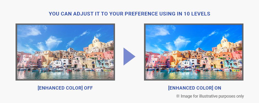 It features "Enhanced Color" for dynamic contrast and vivid expression. You can adjust the settings according to the usage scenario and content, such as vibrant visuals for digital signage and photos or true-to-life colors for PC use.