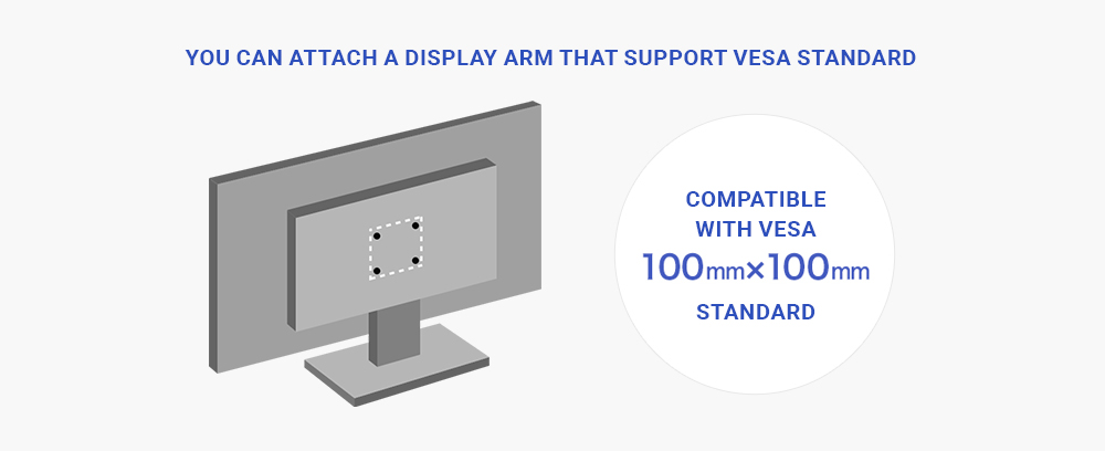 Compatible with the universal "VESA" mounting standard for display arms and stands. It mounts to 100mm × 100mm display arms and stands!