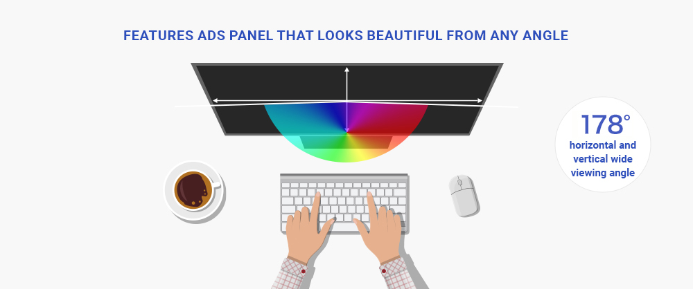 It features ADS (Advanced Super Dimension Switch) panel with a wide viewing angle of 178°in all directions. The color and contrast remain consistent regardless of the viewing position or angle, ensuring a clear image from every perspective.