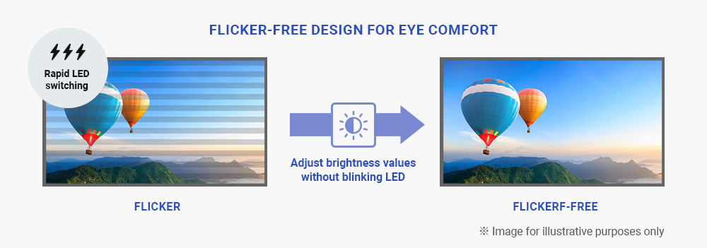 Therefore, it is said that screen flicker can be perceived. Even if you don't notice the flicker, prolonged computer use can strain your eyes. However, this product has "Flicker-free" design that does not rapidly blink the LEDs. Instead, it adjusts brightness by modifying the current level, thereby eliminating flicker.