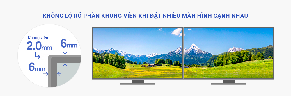 Sản phẩm sử dụng tấm nền không khung viền bằng phẳng không có chênh lệch nhờ vào tấm nền và khung viền. Với khung viền siêu mỏng mang lại ấn tượng gọn gàng. Do không có khung viền, màn hình rất phù hợp để sử dụng trong thiết lập đa màn hình. Thiết kế màn hình LCD thời trang phong cách này phù hợp cả với văn phòng lẫn phòng riêng.